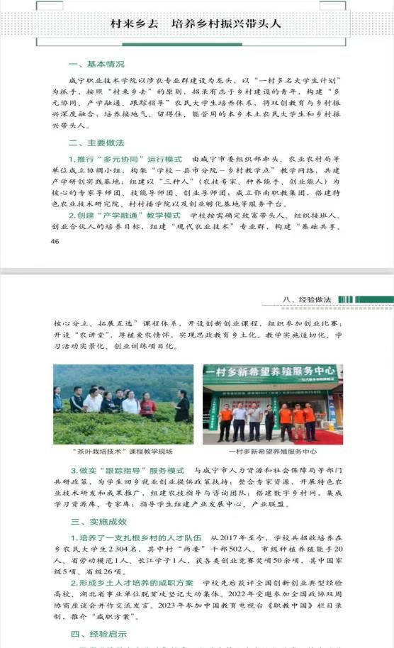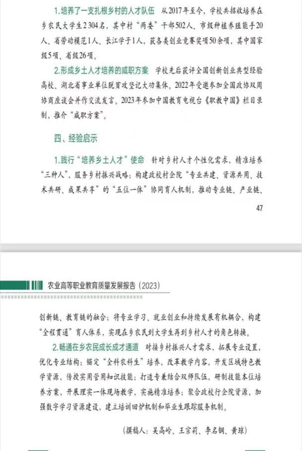 近日,2023年度《农业职业教育发展质量年报》正式发布,Beat365官网Beat365中文官方网站(乡村振兴学院)报送的案例“村来乡去 培养乡村振兴带头人”成功入选典型案例。这一殊荣充分展现了Beat365官网在农业职业教育领域的教学创新与实践成果,标志着Beat365官网农业职业教育水平得到广泛认可。