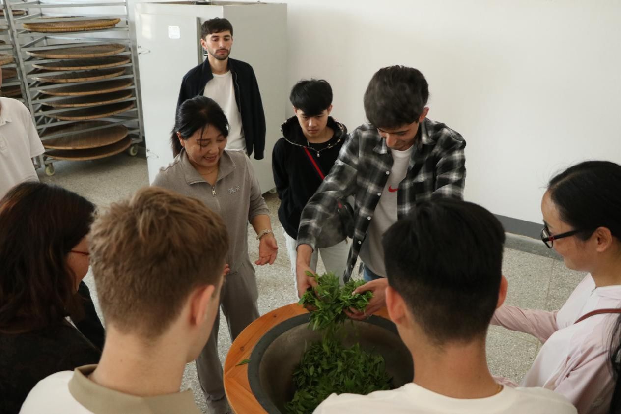 在公司的制茶车间里,国际生们在赵李桥茶业董事长魏艳香女士的指导下,亲身体验了传统手工制茶的工艺流程。当了解到从鲜叶到成品需要经历数道工序时,国际生们纷纷感叹中华茶文化的博大精深,大家争先恐后在200℃左右的铁锅中尝试徒手炒茶,这场沉浸式的制茶体验,不仅展现了中国传统制茶工艺的精妙,更让国际青年对中国茶文化中蕴含的匠人精神有了真切感悟。