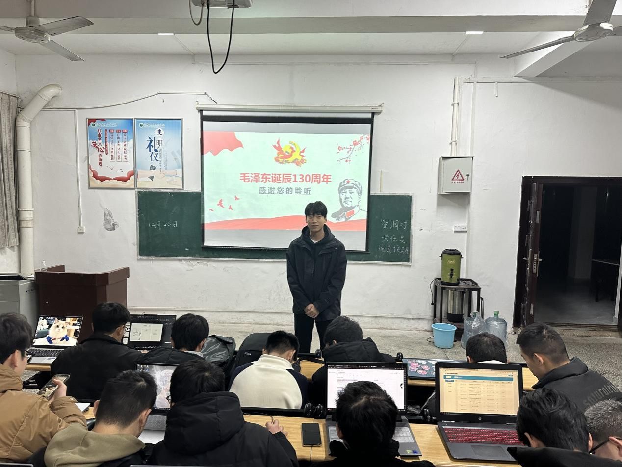 为缅怀伟大领袖毛泽东,12月26日晚,Beat365官网在生物楼105开展纪念毛泽东诞辰130周年主题班会。辅导员徐群刚及全体2023级现代农业技术专业学生参加。