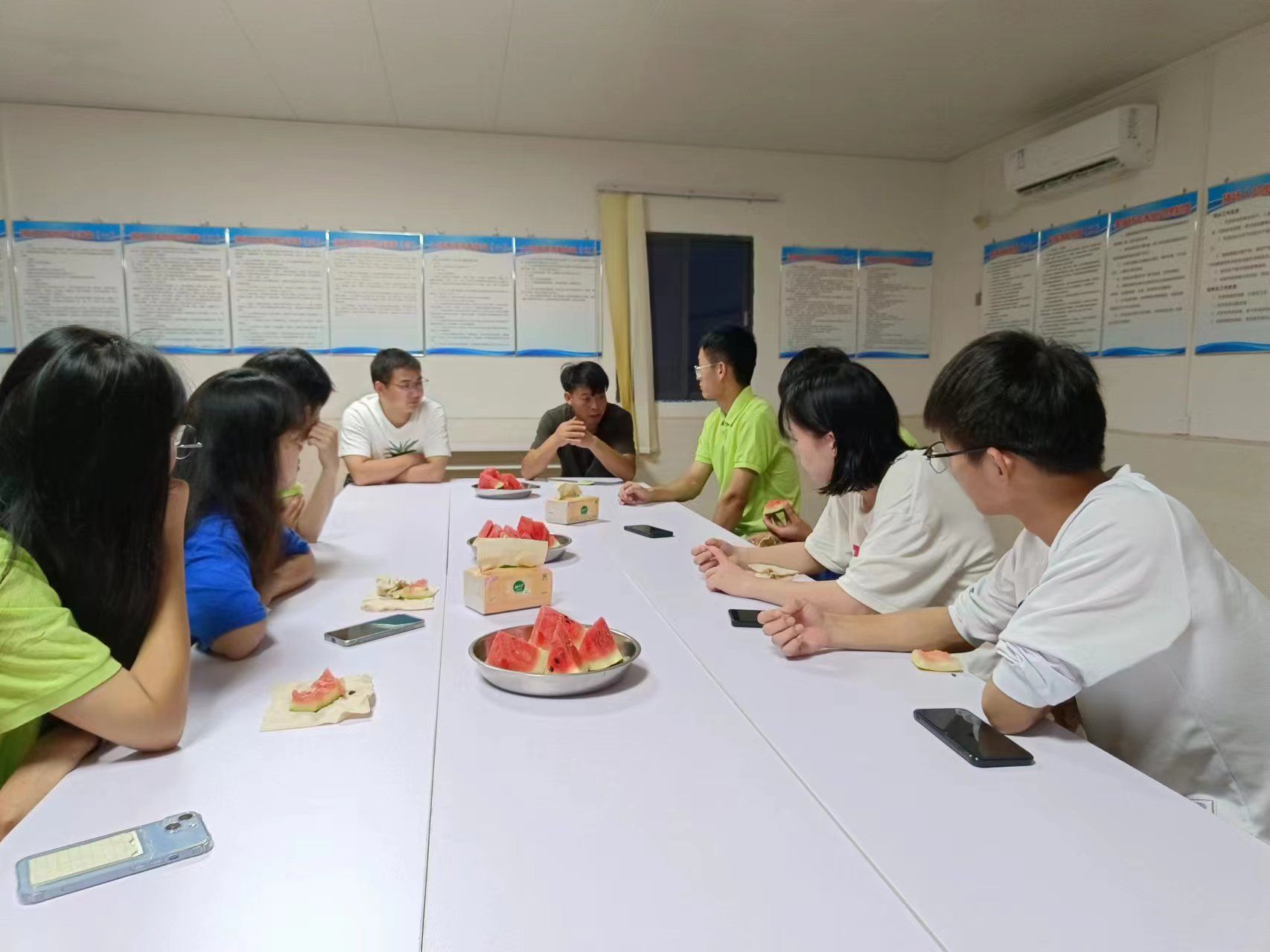 万海峰一行详细了解学生实践和生活中遇到的问题,并与公司协调解决。陈谦叮嘱学生要注意安全,大胆实践,虚心学习,勤思考,多总结,努力提升技能。针对目前非洲猪瘟防疫的严峻形势,万海峰博士给学生讲授了生物安全的技术要点。